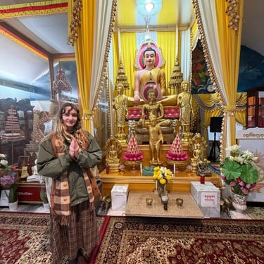 At the Cambodian Temple, I found trust. Unattended and open, the temple offers refuge for those passing through. Leaving our shoes at the door, we stepped into an intricate building with a golden altar, murals around the ceiling, and open meditation cushions. It amazed me how generous the practitioners were to leave the space open even when not in use and the trust that comes with that (granted they had cameras). With great timing, their bathrooms were my grace and seeking warmth away from the wind eased my body.